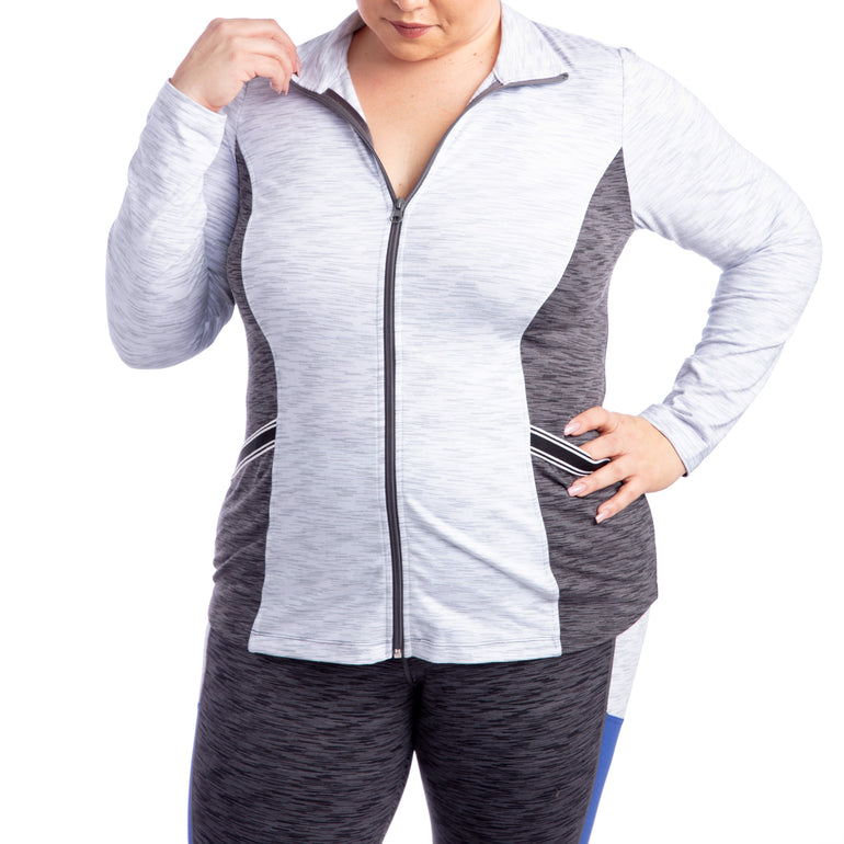 The super-soft space dye fabric provides lightweight comfort and stretch whether worn as an everyday jacket or for outdoor workouts. Full front zip opening allows customizable ventilation.